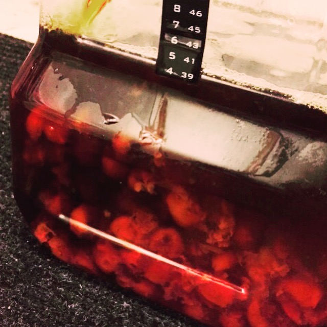 | Sour cherries sit on the bottom of the carboy as I siphon sour red beer on top. A Kriek is a brewing! |